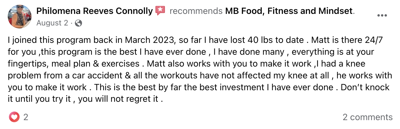 Until one day I found Matt on Facebook. Matt set me up on a program that I could follow and that I enjoyed doing. He is awesome and always there for support when you need it. I have lost 28 pounds and many inches and am feeling great. I still have a journey to finish and Matt will be there til the end. I never thought that I would find a program that would work for me but Matt’s program worked! - Jacqueline Drew-Woodward